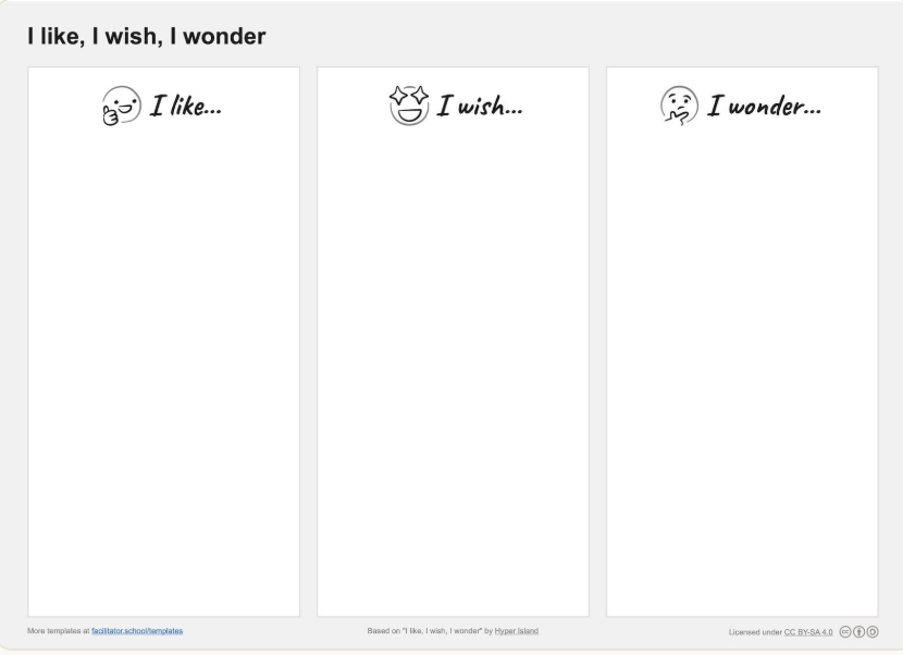 "Gather feedback by giving participants easy sentences to complete. I like, I wish, I wonder is a simple reflection method to gather feedback in the moment by letting participants complete the sentence "I like...", "I wish..." and "I wonder...". The simplicity of the method makes it very versatile and time effective."